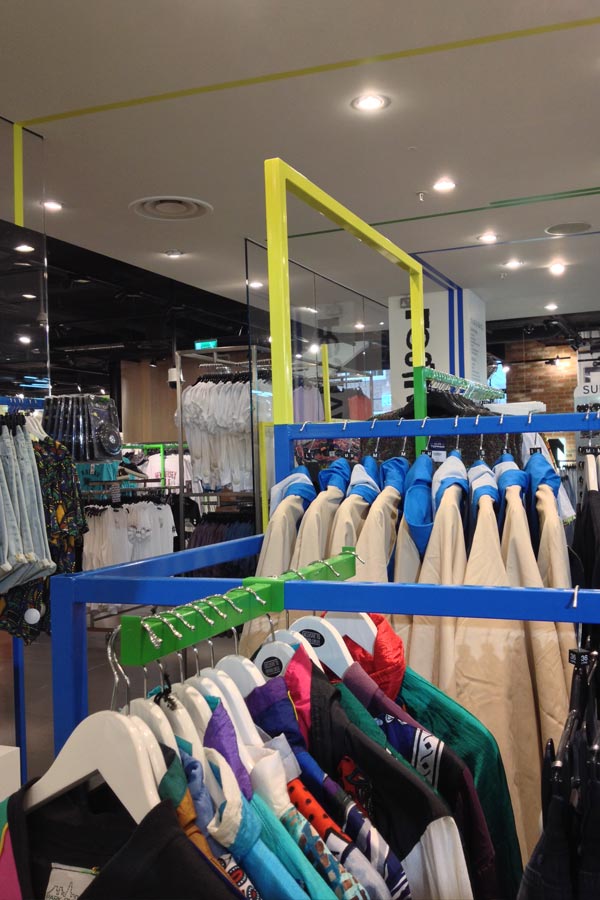 D1 Design & Creative have recently been working closely with Topman's flagship store in Oxford Street on a number of projects, as seen in our previous posts. We are pleased to bring you photos of our latest project. D1DC have designed and manufactured a number of bright coloured rails and white plinths to display their summer festival wear. These fixtures have been designed to interlock and interchange.